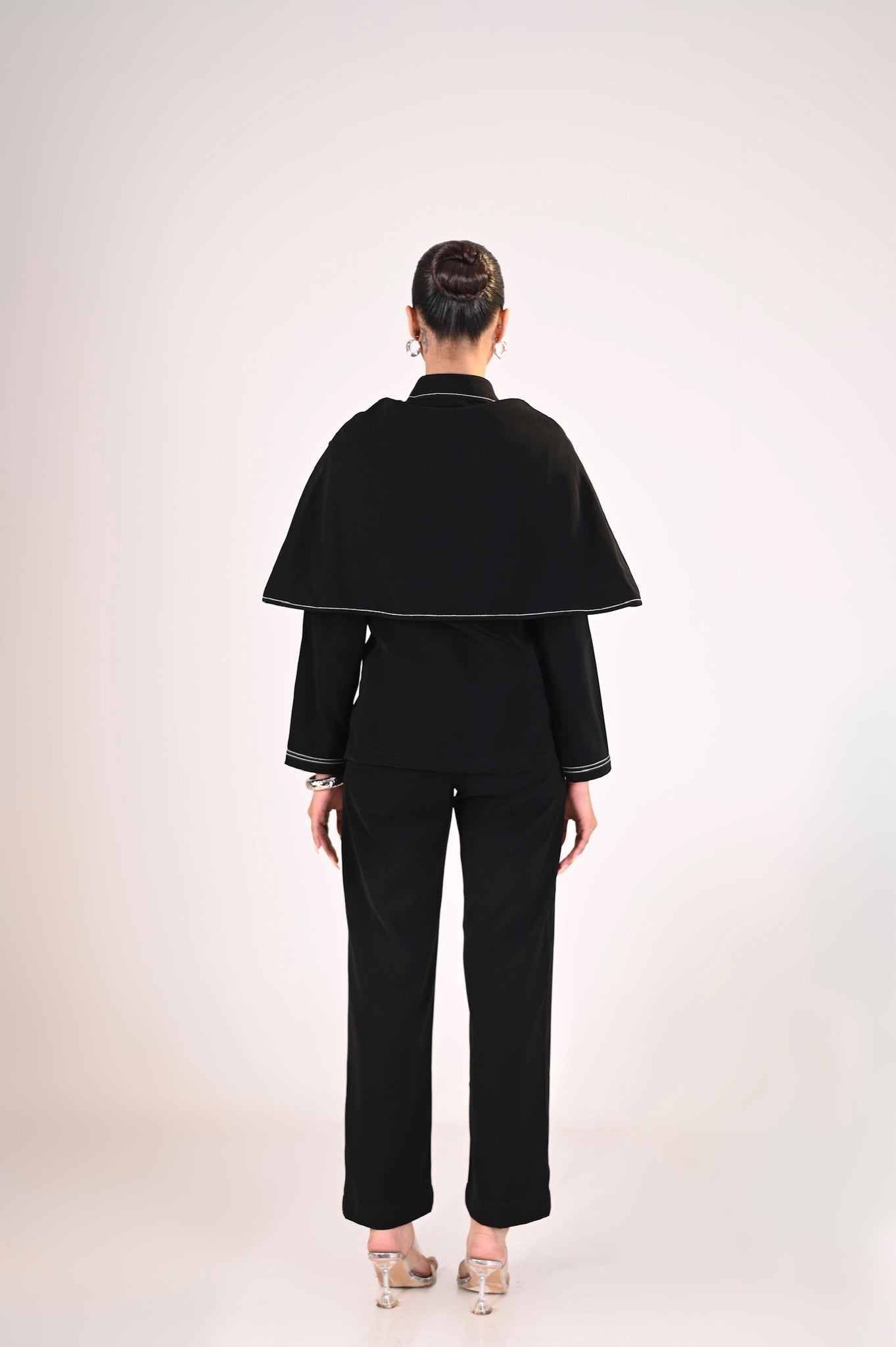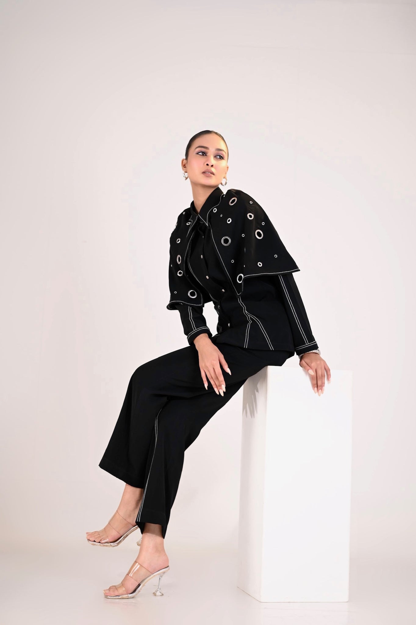 This striking black top blends sharp tailoring with futuristic grommet detailing for a bold edge. The structured top drapes effortlessly, creating a modern silhouette enhanced by contrast stitching. Sleek, sophisticated, and full of attitude this top is designed for the woman who owns her presence. Perfect for statement evenings or elevated daywear.