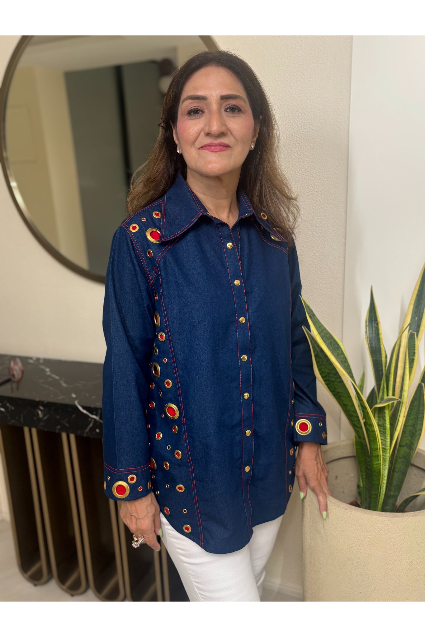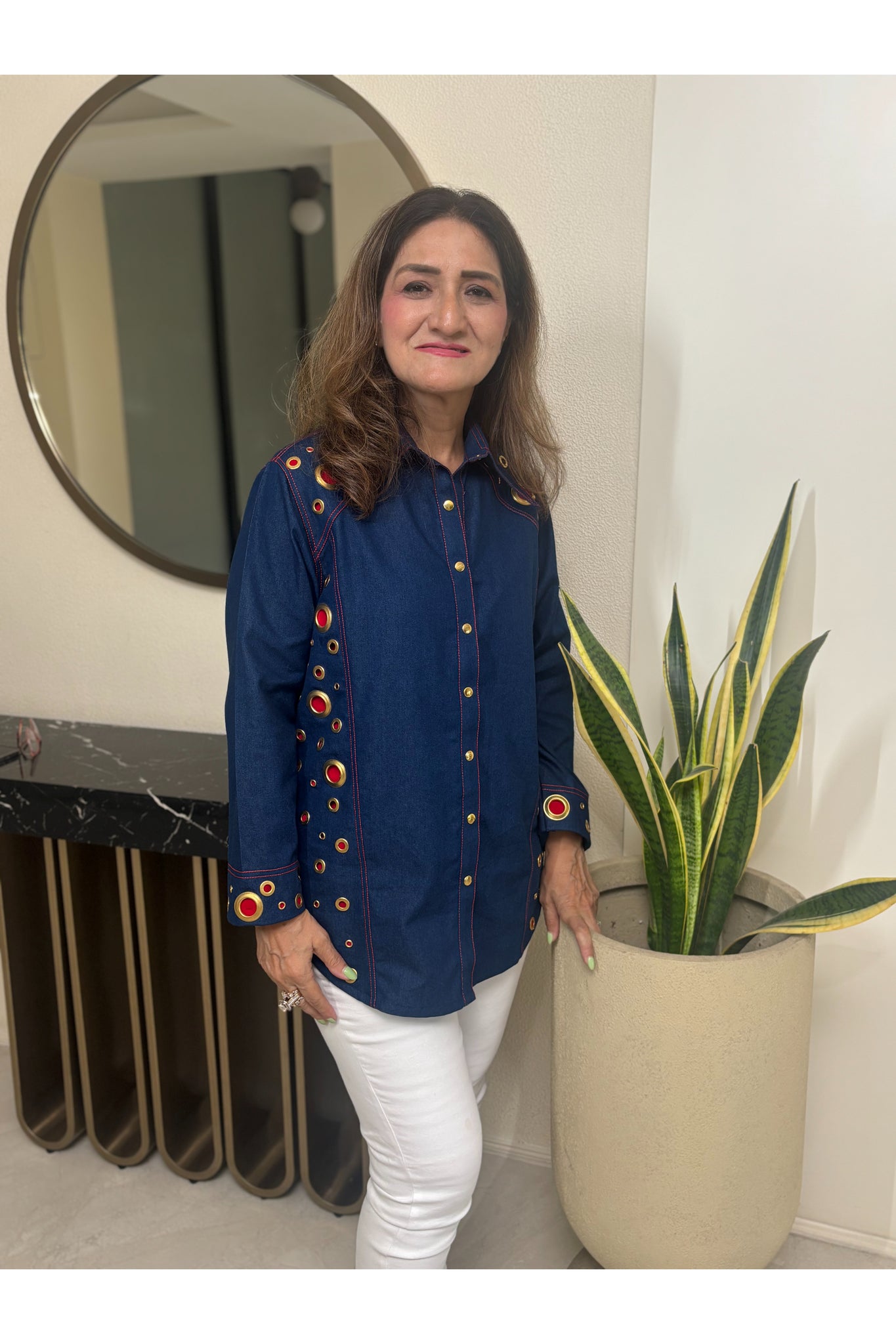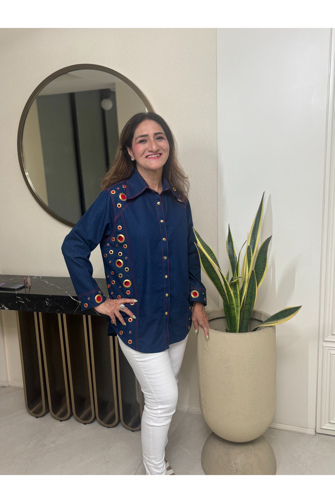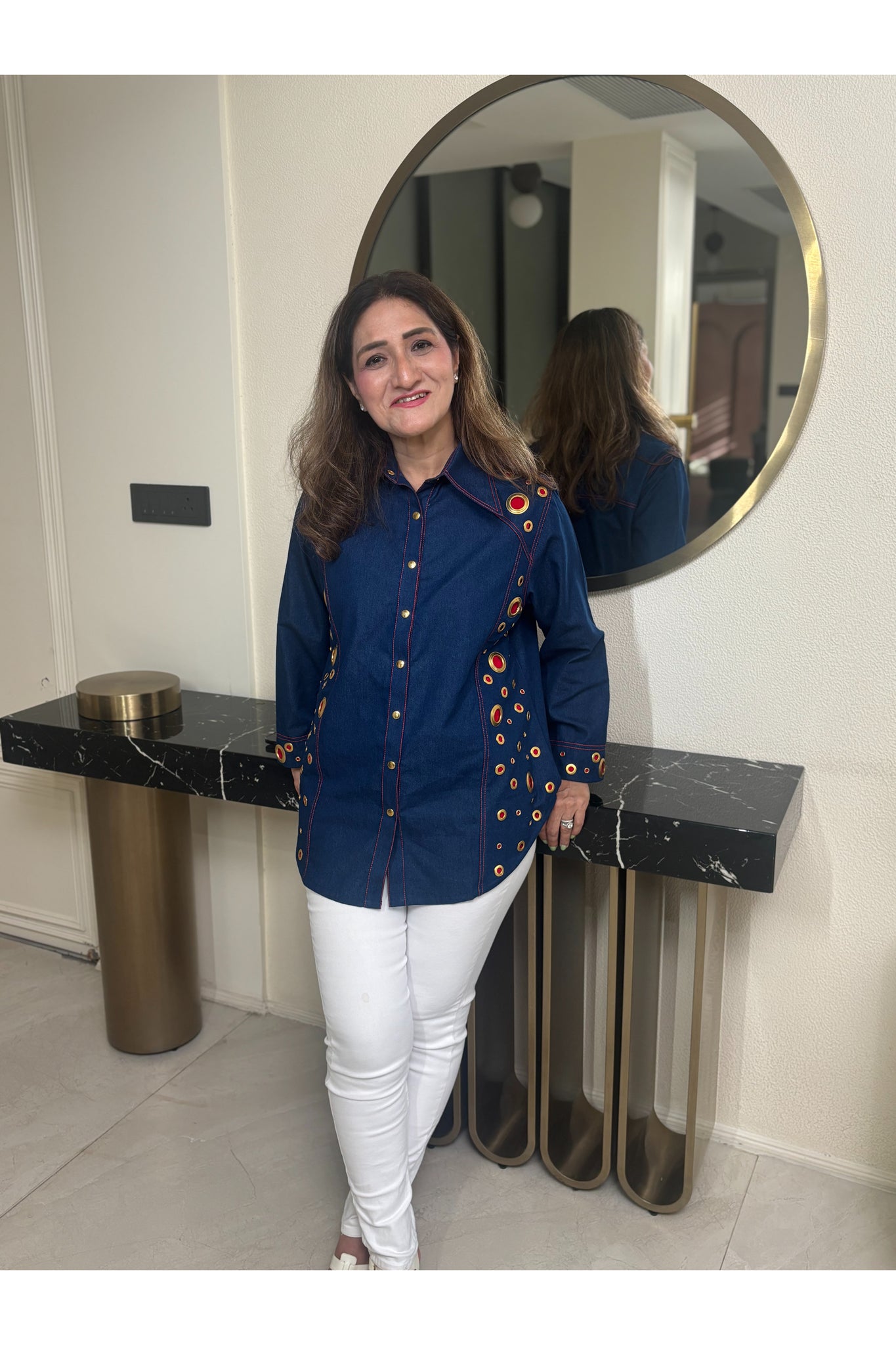 The Denim Ember Shirt brings structure and subtle drama with its gold button-down front and crisp shirt collar. Crafted in a beautiful denim fabric, it features a relaxed silhouette with dropped shoulders and a soft drape, allowing ease without compromising on form. A refined essential with a glint of contrast.