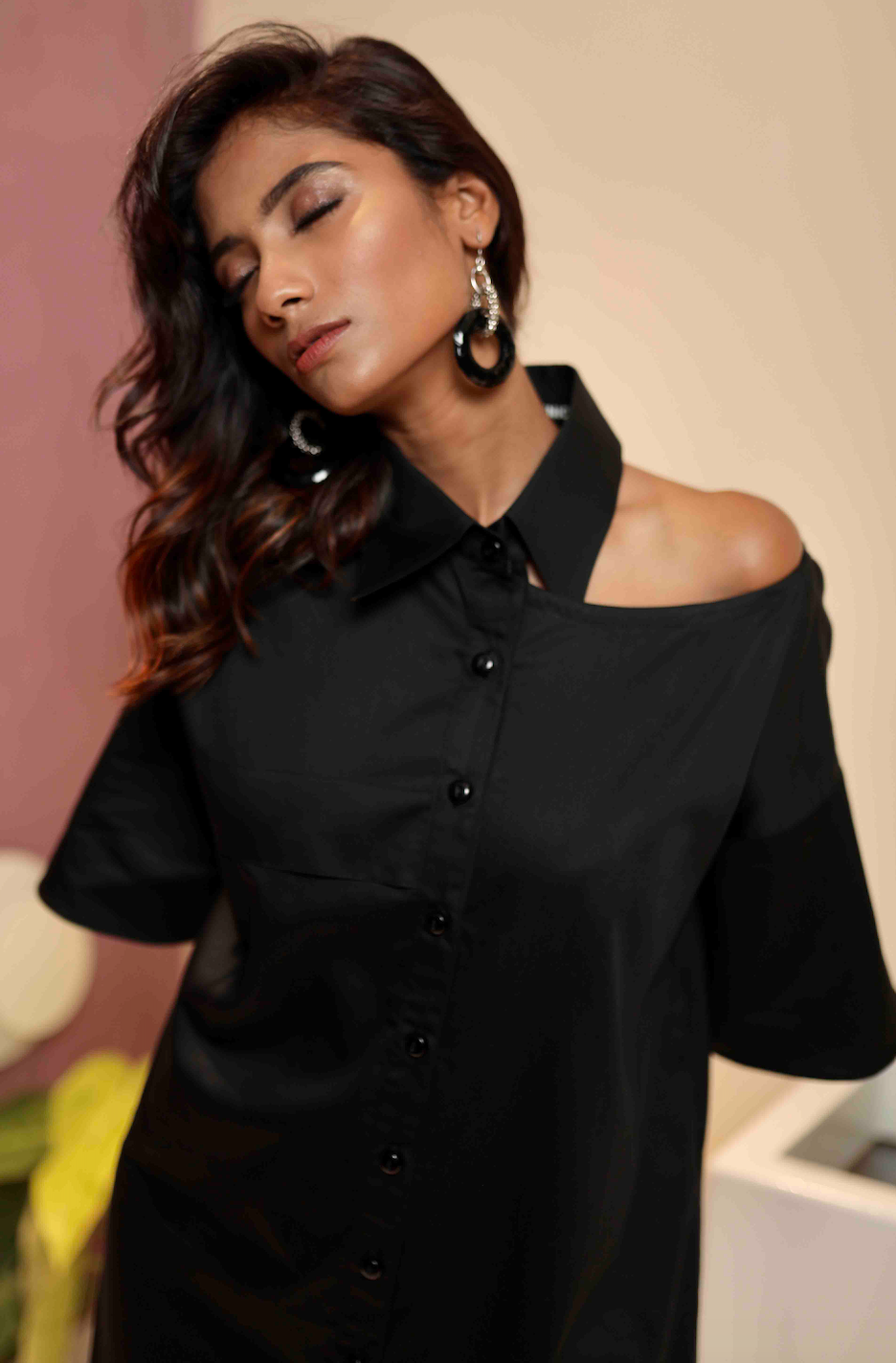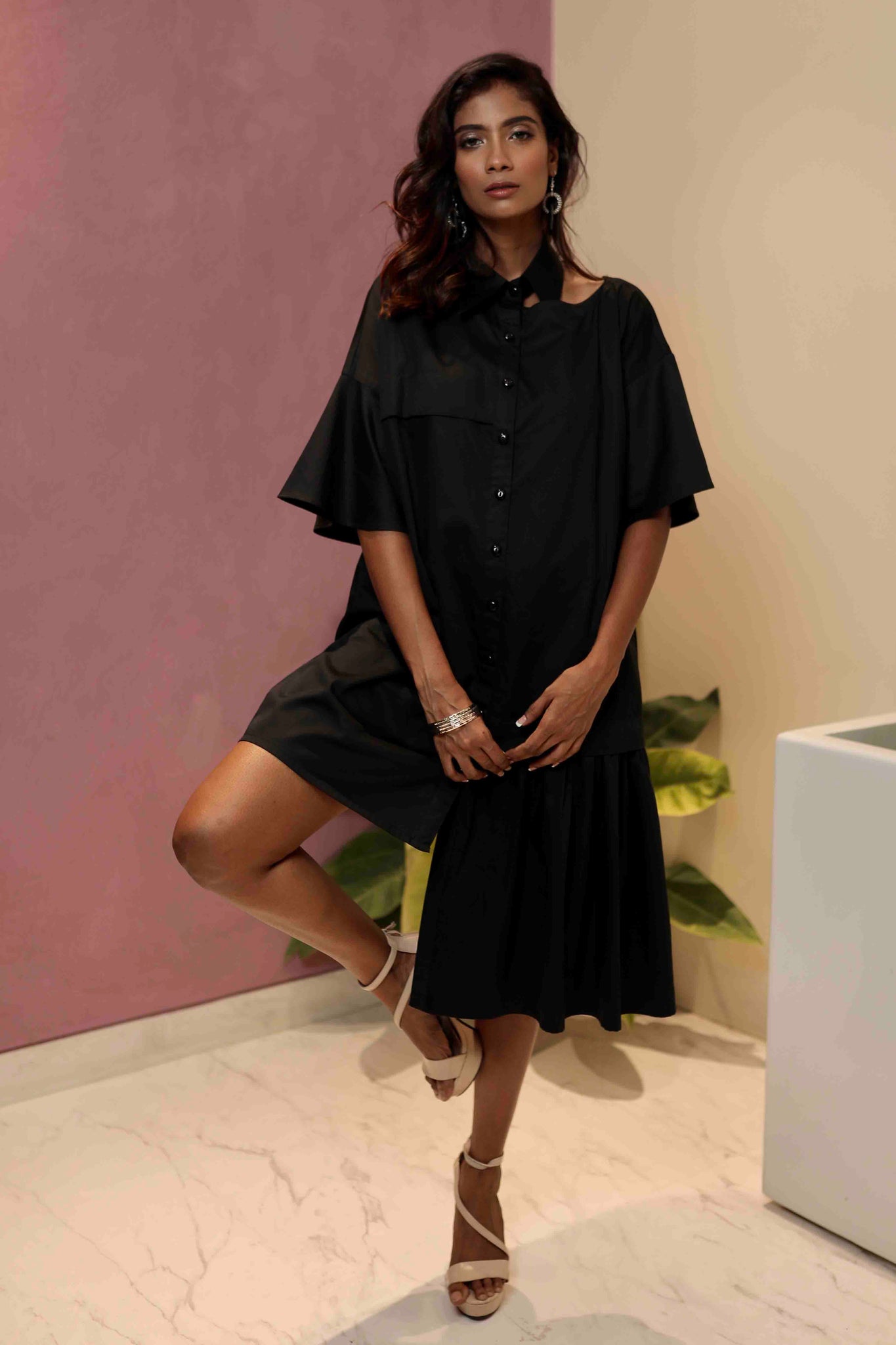 Nothing better when you want to put together a chic no brainer look than this dress. With its statement collar and asymmetrical bottom this dress will surely make an impact.