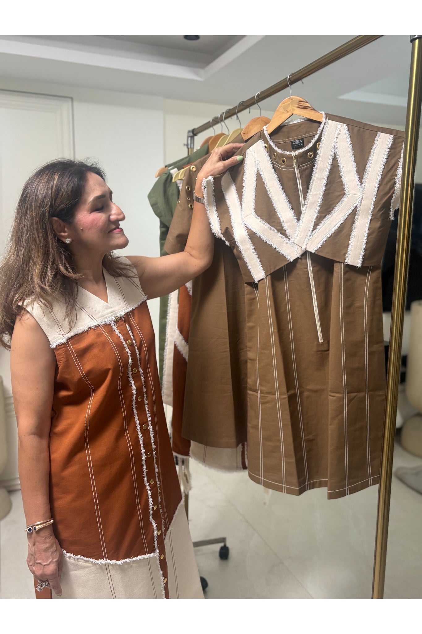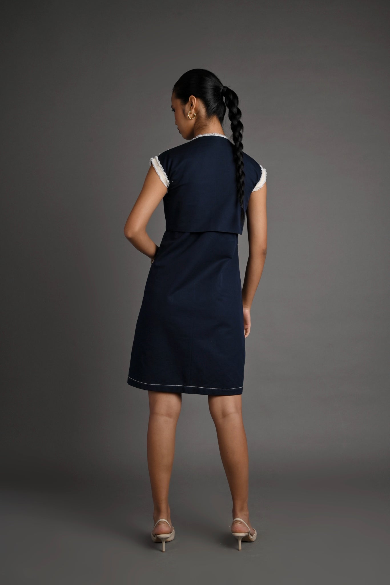 A seamless blend of structure and statement, the Harbor Stripe Dress features a sleek navy shift dress paired with a cropped jacket. The jacket stands out with bold ivory panels and raw-edge detailing, adding texture and dimension to the clean silhouette. Contrasting white topstitching elongates the form, while metallic eyelet accents at the neckline lend a subtle, modern edge. Perfect for refined daywear or a polished evening look with a twist.