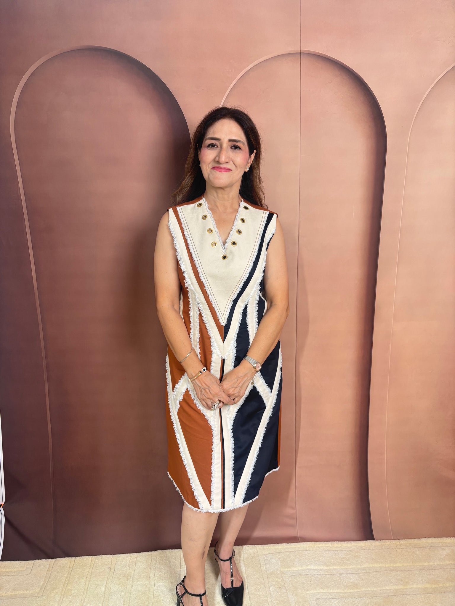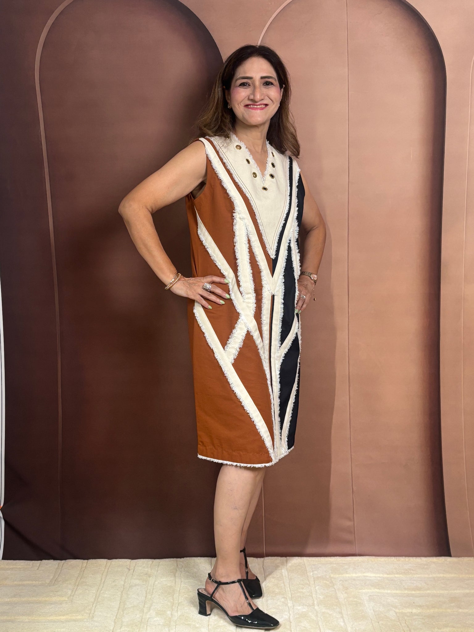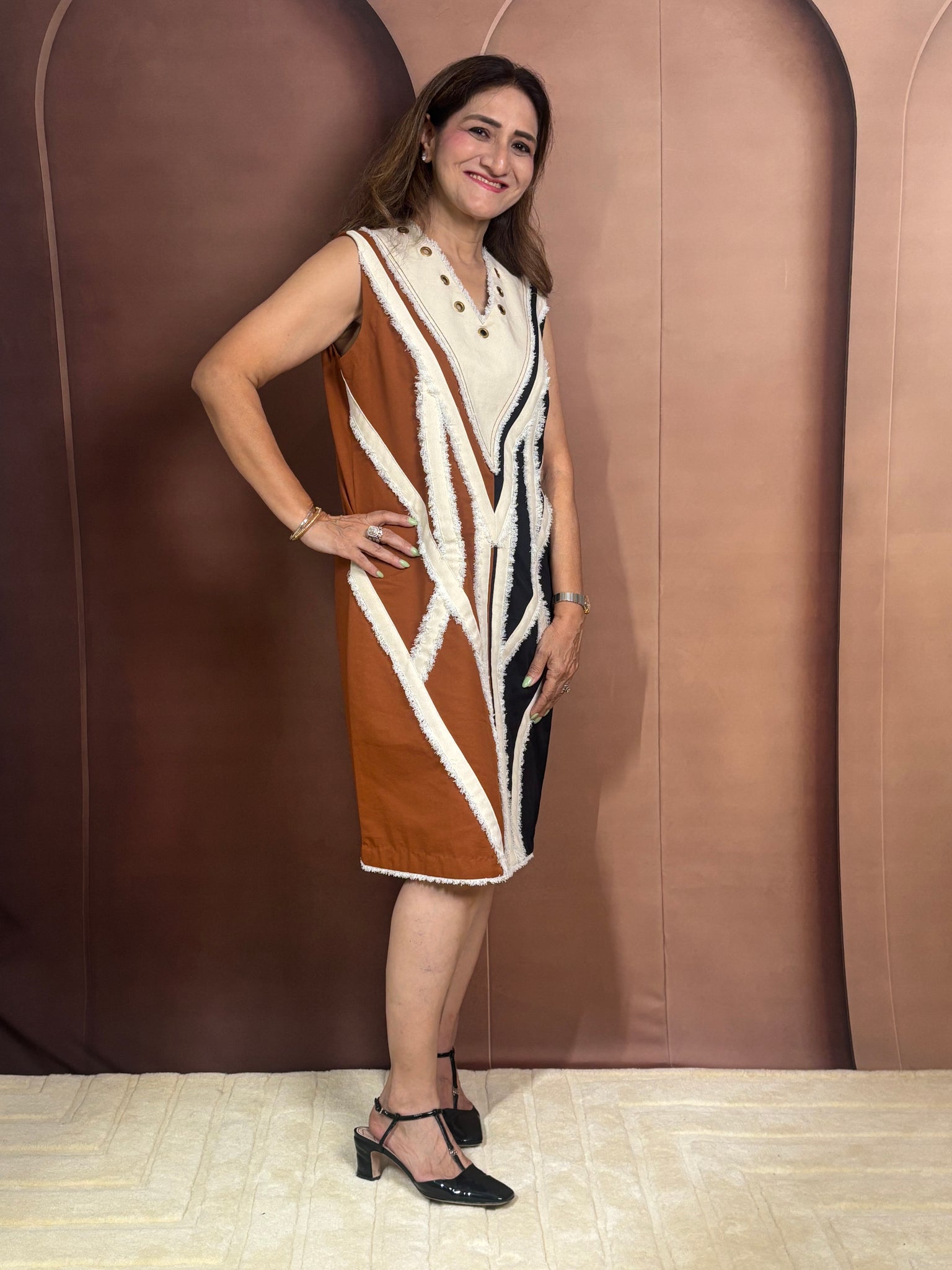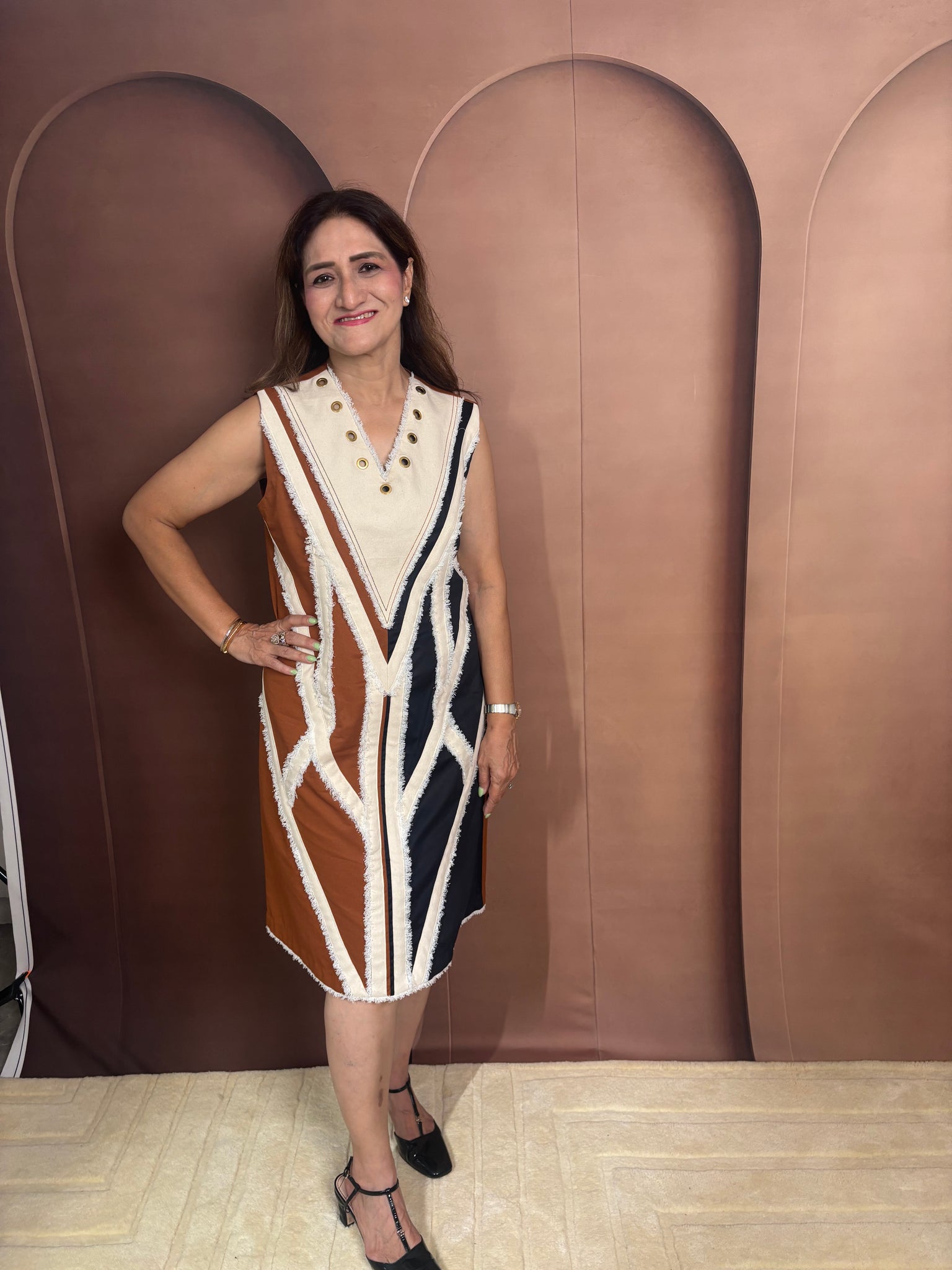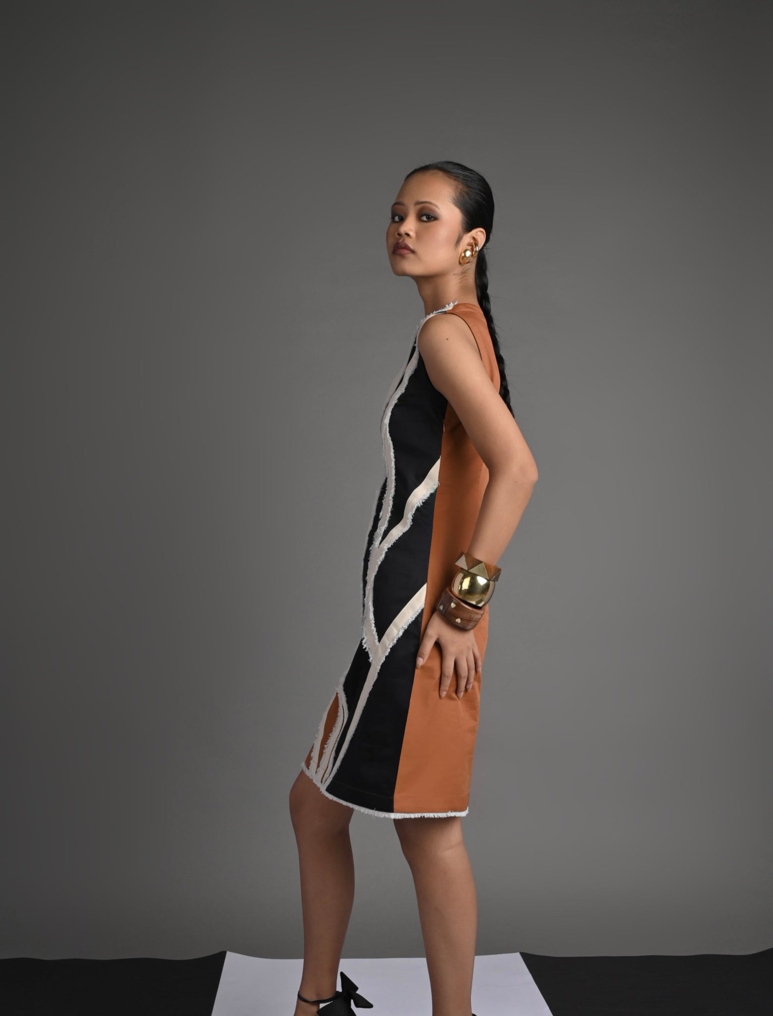 Elevate your wardrobe with this bold, geometric color-blocked shift dress—a striking fusion of modern elegance and vintage flair. Featuring a sleeveless cut and a flattering V-neckline adorned with statement gold grommets, this piece is crafted with contrasting panels in warm rust, ivory, and jet black tones. The textured raw-edge trim adds a contemporary edge, while the tailored silhouette ensures effortless sophistication. Perfect for making an impression at art gallery openings, cocktail evenings, or upscale brunches, this dress exudes confidence and style with every step. Pair it with minimalist heels and bold accessories for a complete look.