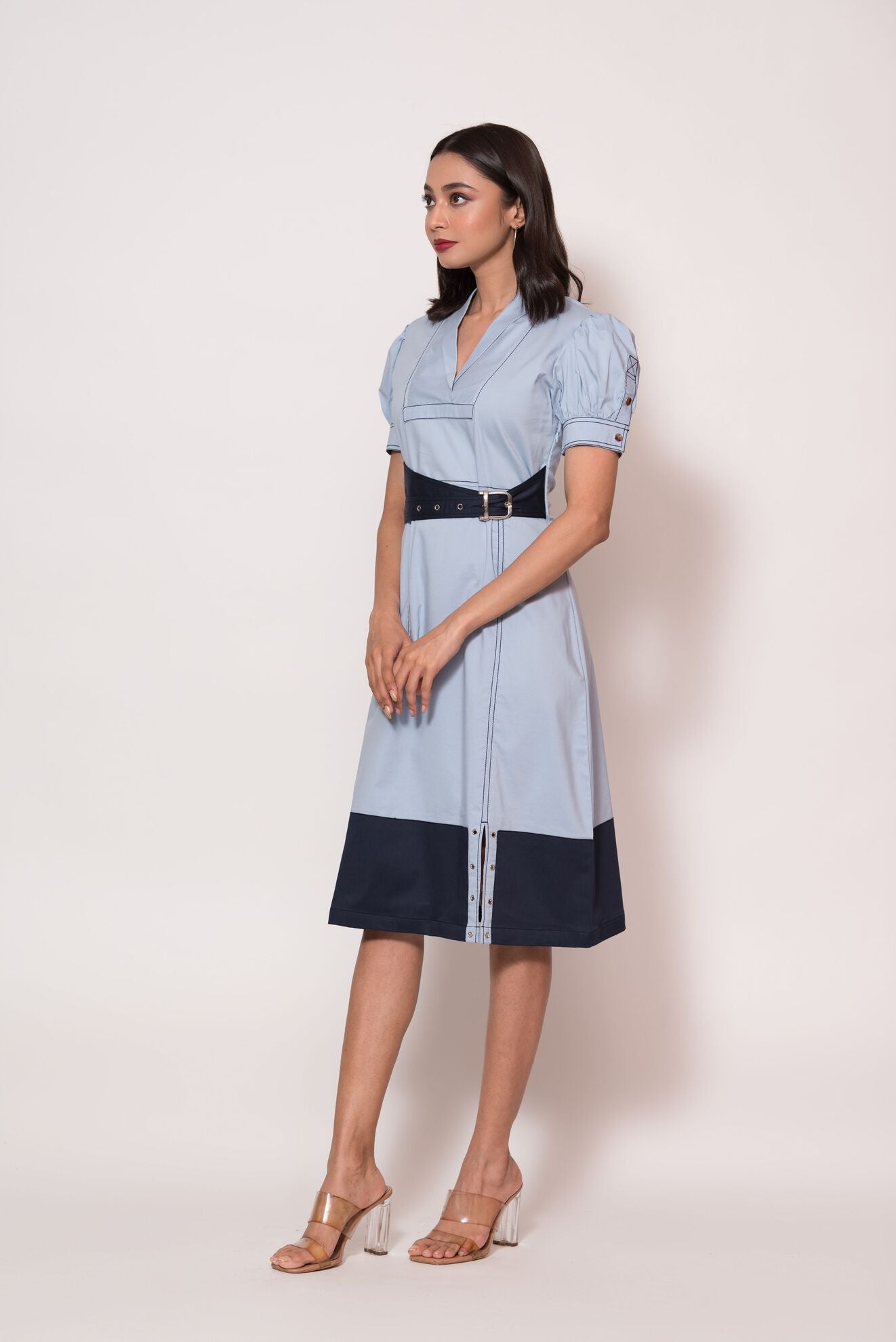 Description: What's better than a statement belted dual toned dress? Nothing . You know you need this dress in your life , get it now !!! |