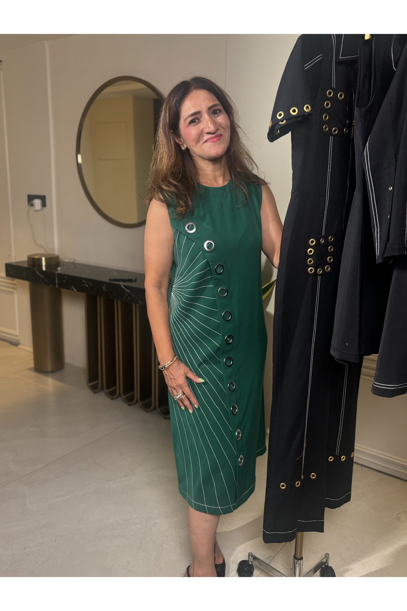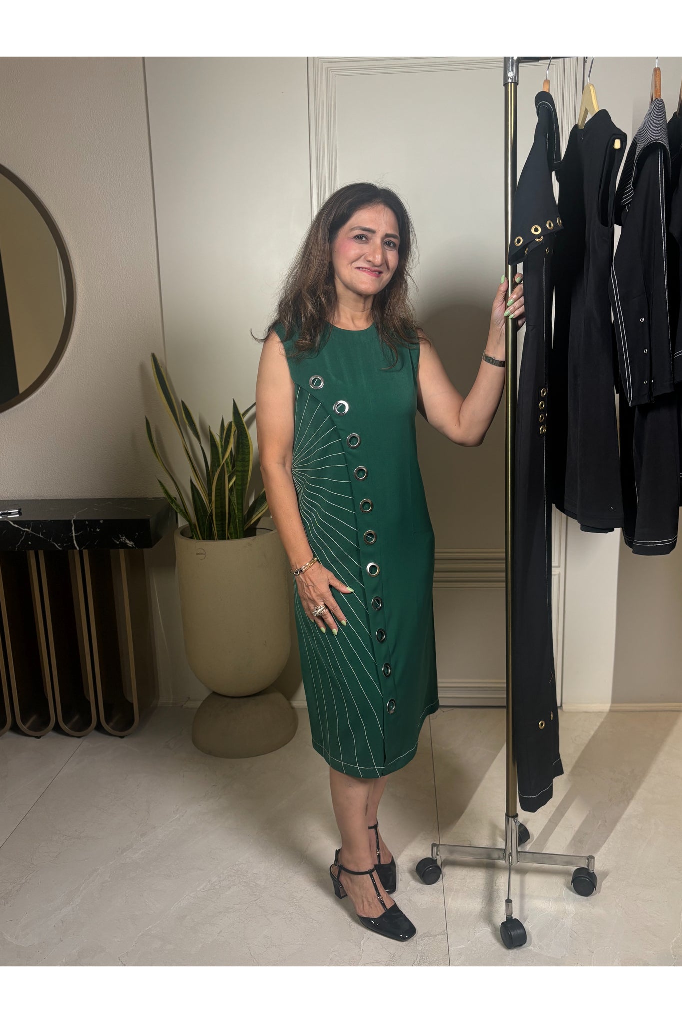 Make a bold statement with this midi dress, a sleek and contemporary piece designed for those who embrace elegance with a twist. This sleeveless black dress features a unique asymmetrical design with metal details and fine pinstripe accents that cascade diagonally, adding a touch of movement and sophistication.