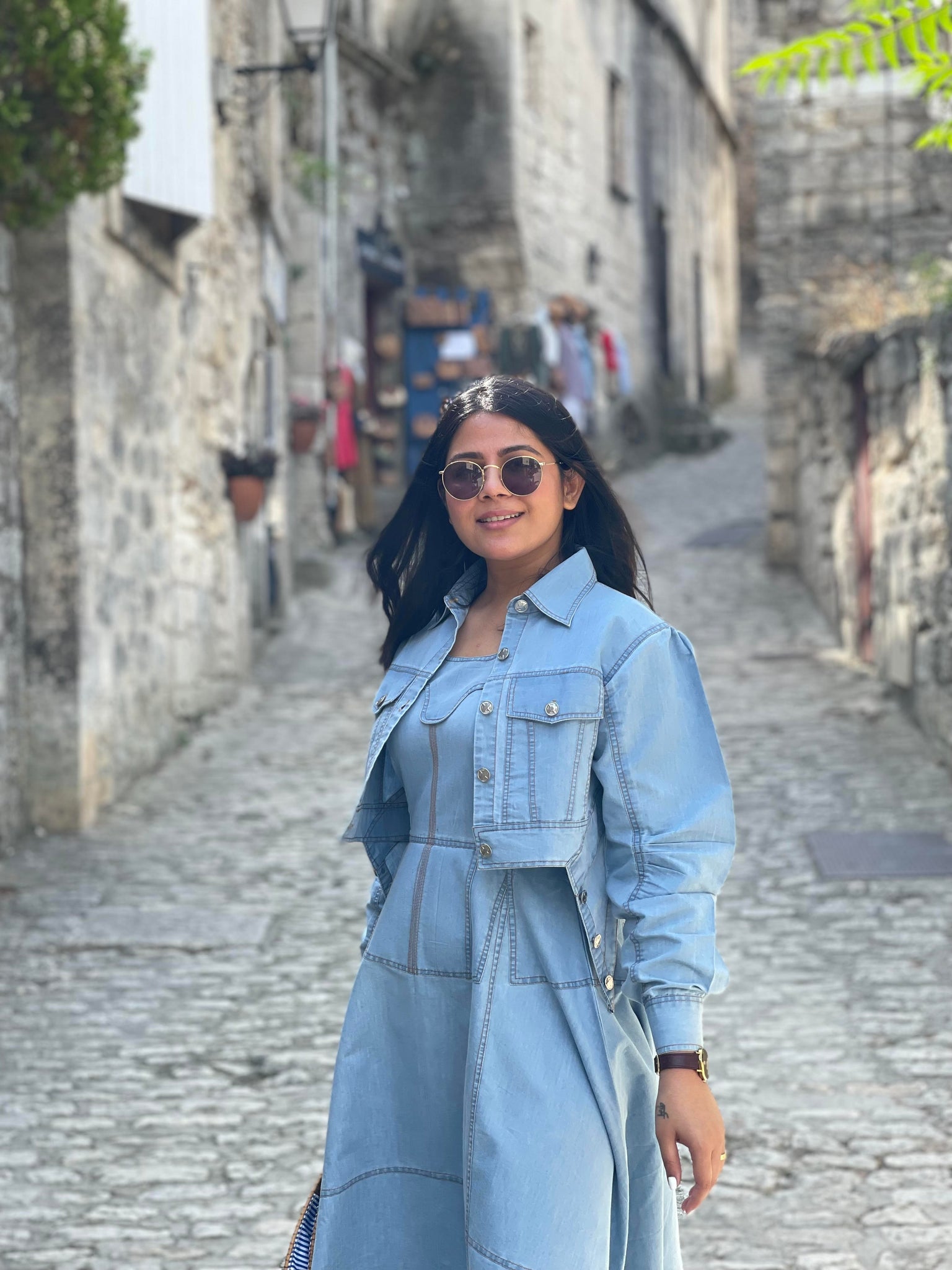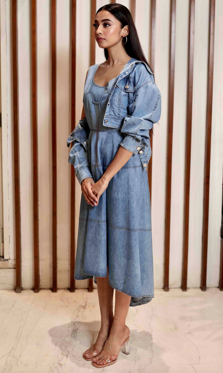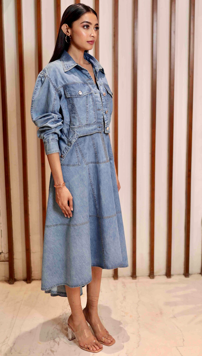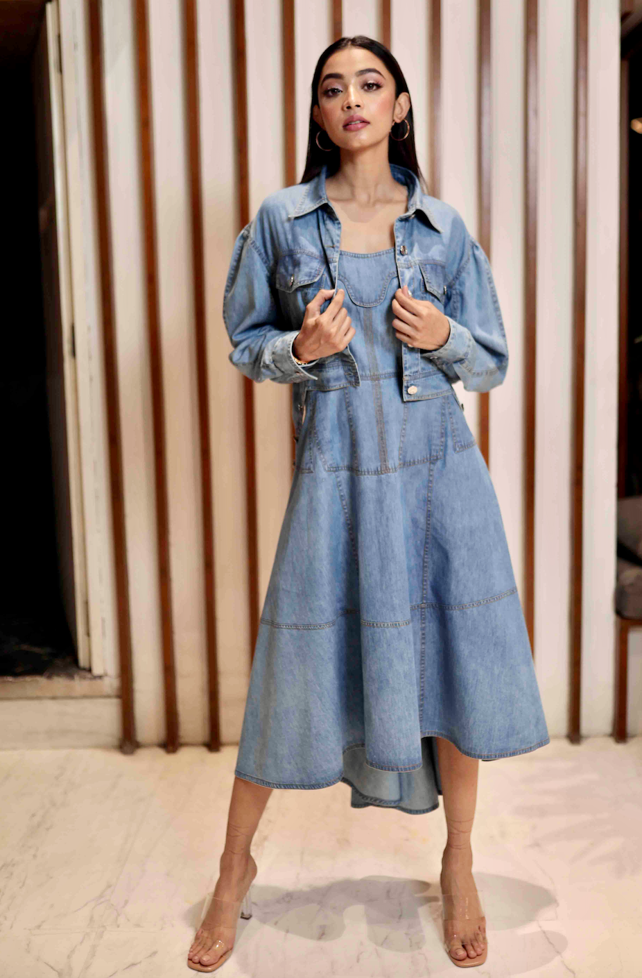 Sway away in style in this chic blue dress . With or without this sure fun denim jacket , its the perfect look for your Sunday Brunch with friends. Style it with an off-white hairband a pair of white tie up shoes to complete the ensemble.