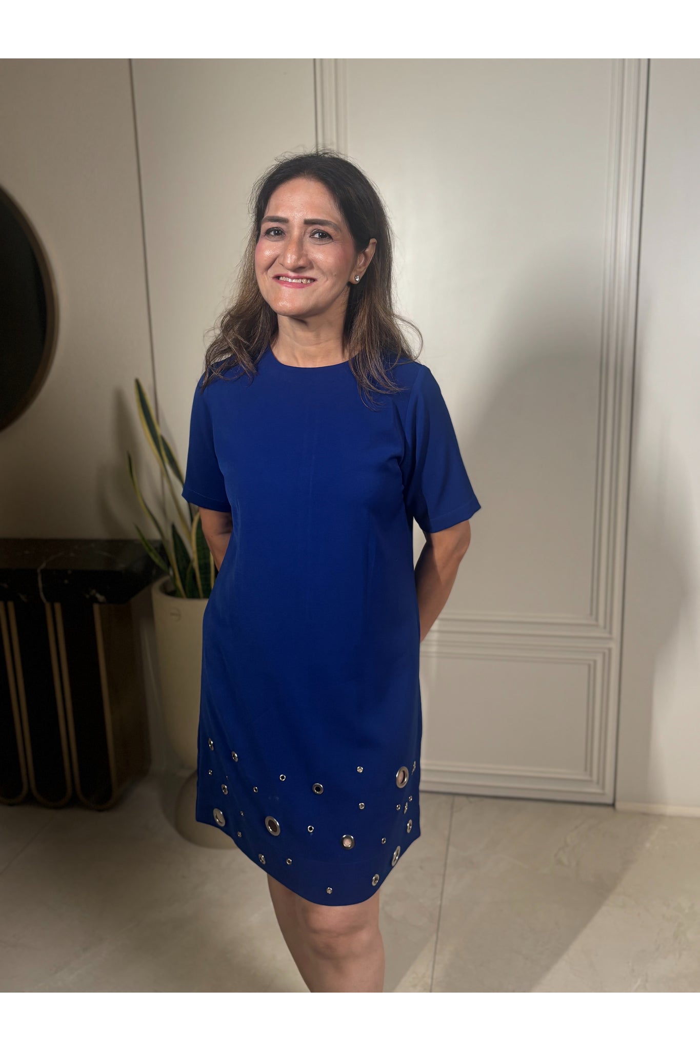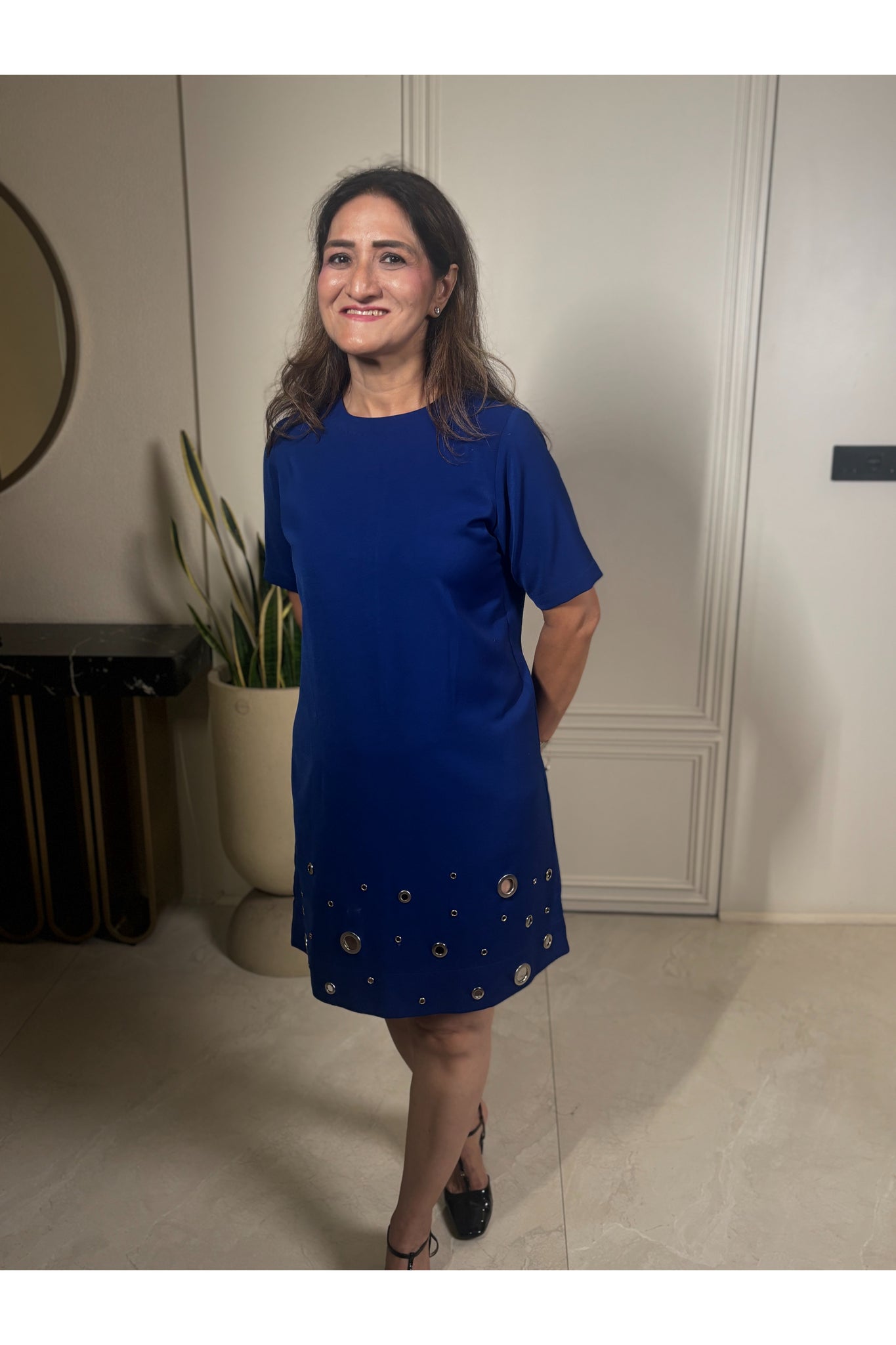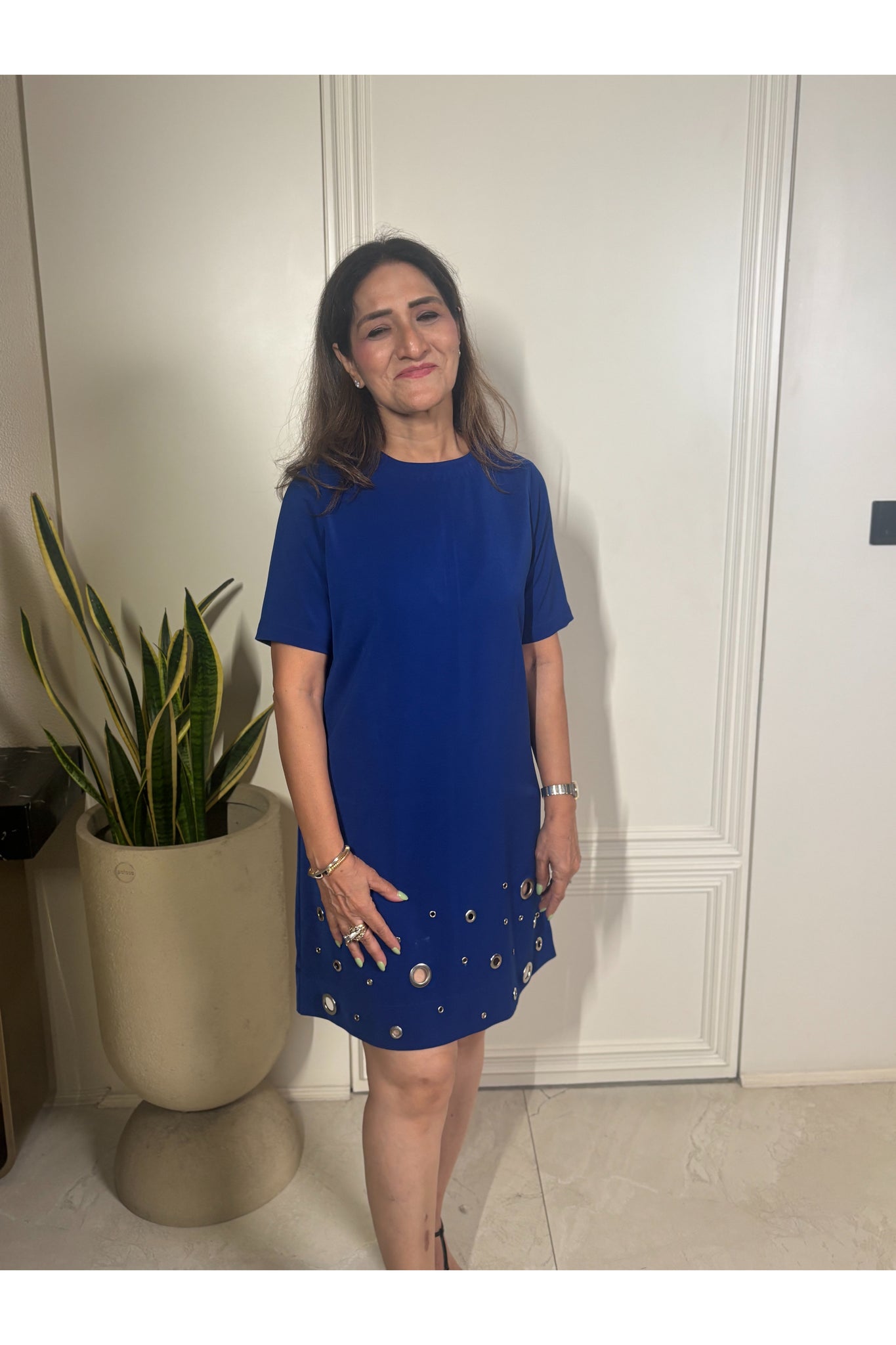 Make a bold entrance in the Midnight Muse Mini Dress. This sleek royal blue dress features a classic, comfortable silhouette that’s anything but ordinary. The hemline is adorned with a stunning array of metallic eyelets and studs, adding a touch of rebellious glamor and modern edge. Perfect for a night out or a chic event, this dress is designed for those who love to stand out.