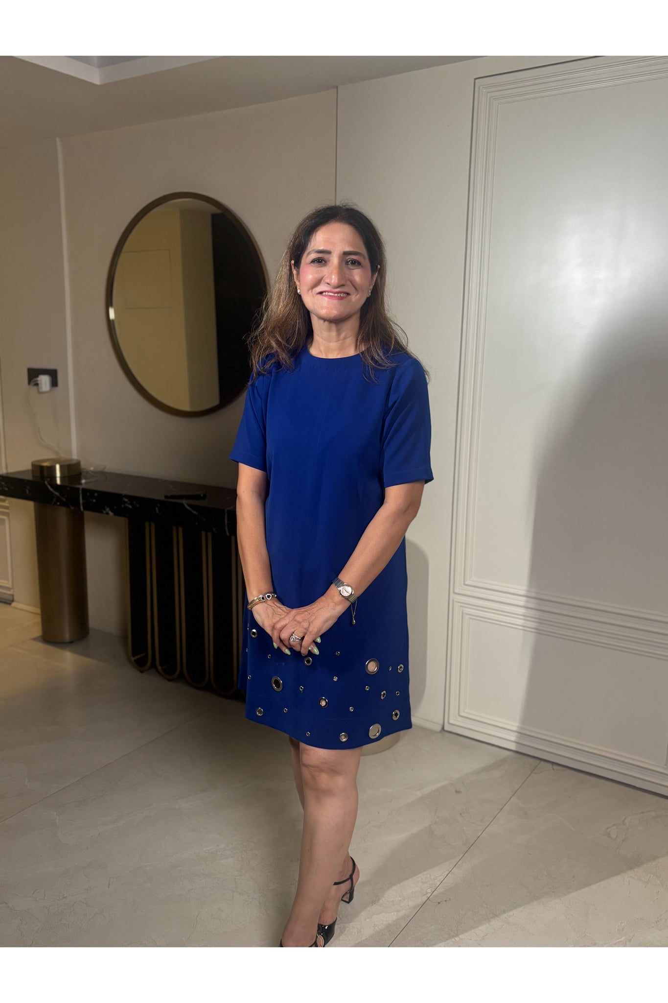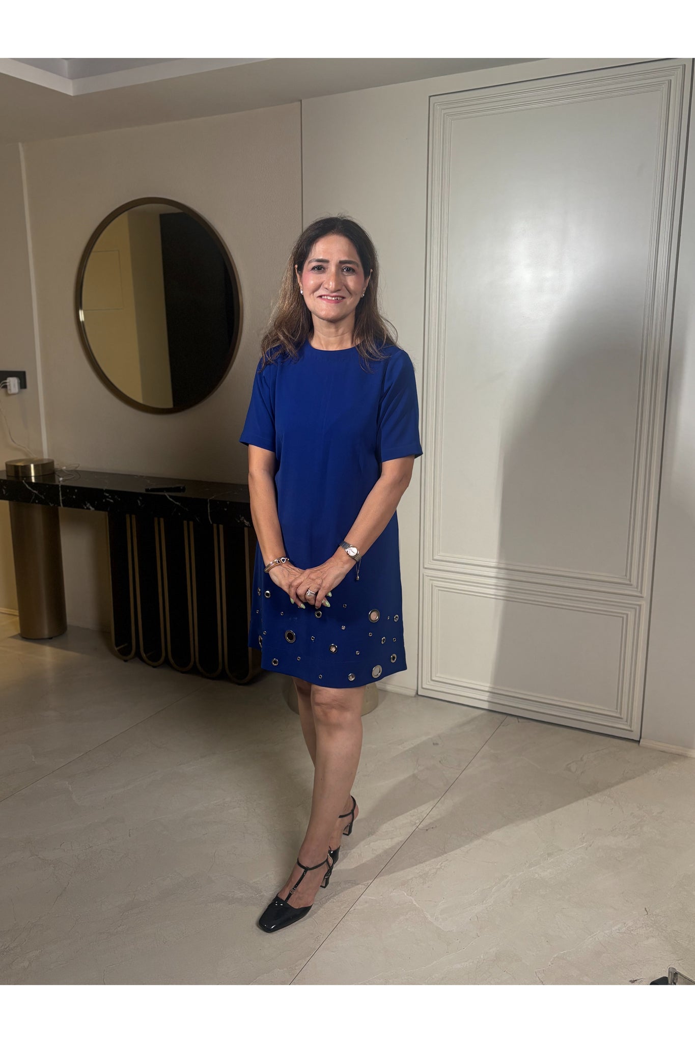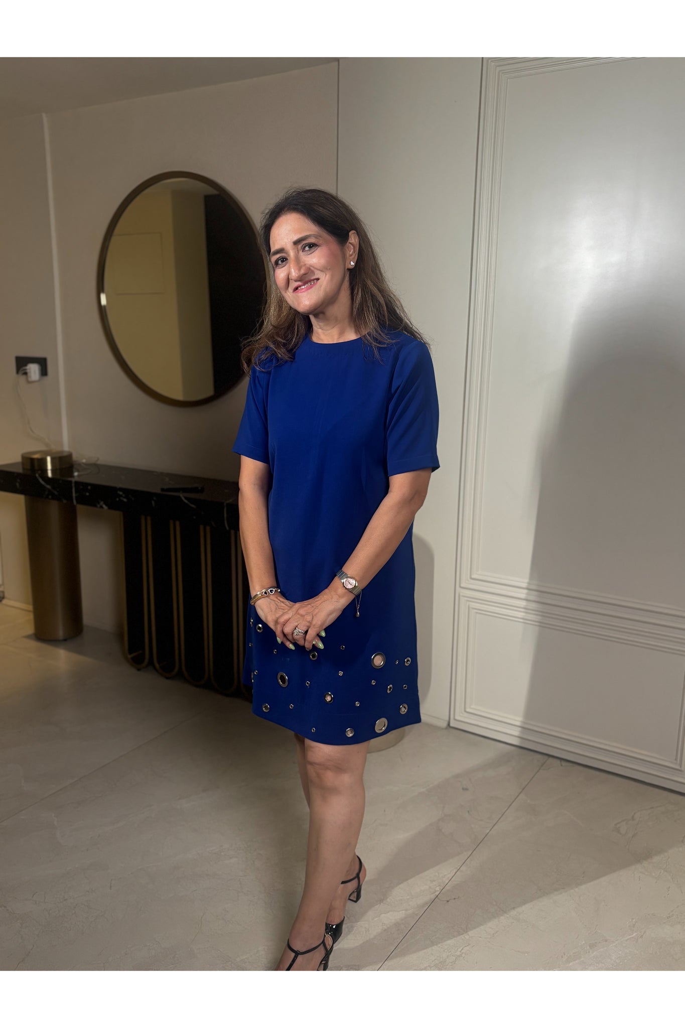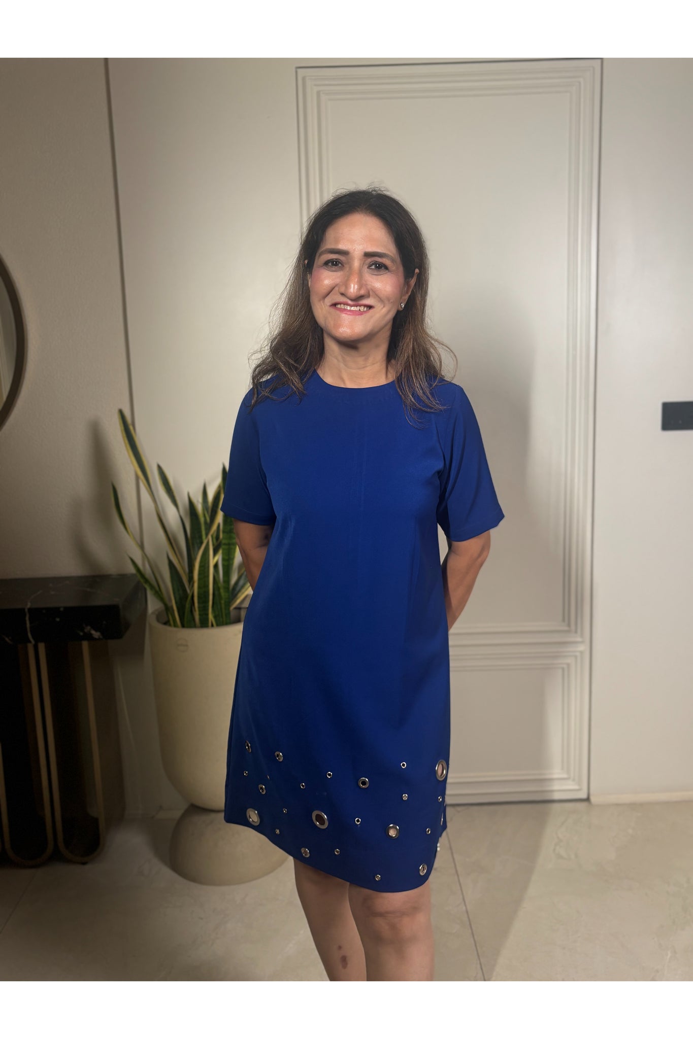 Make a bold entrance in the Midnight Muse Mini Dress. This sleek royal blue dress features a classic, comfortable silhouette that’s anything but ordinary. The hemline is adorned with a stunning array of metallic eyelets and studs, adding a touch of rebellious glamor and modern edge. Perfect for a night out or a chic event, this dress is designed for those who love to stand out.