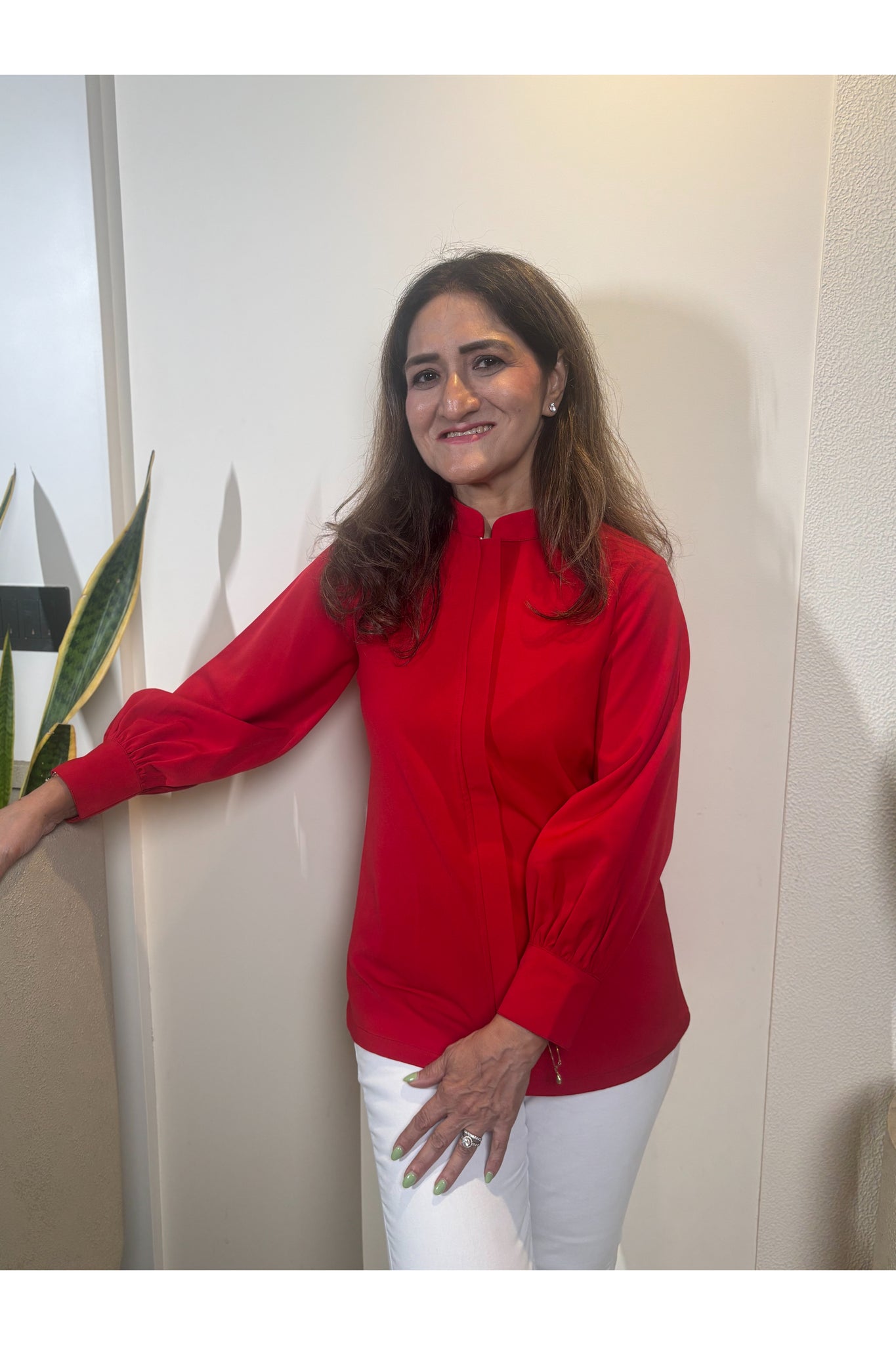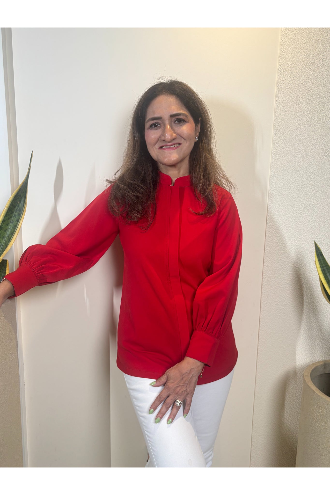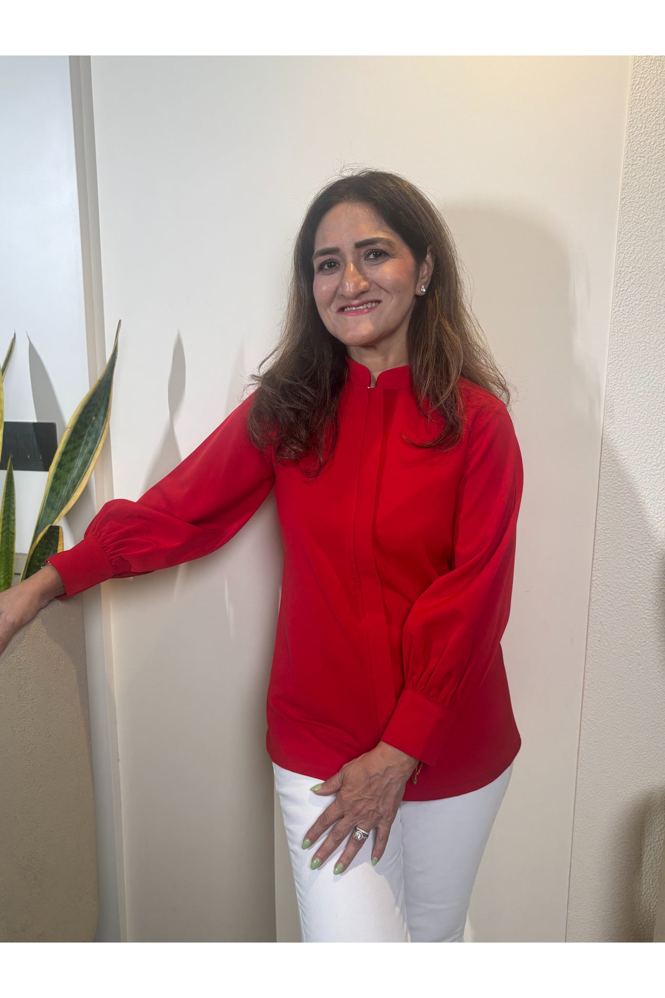 Elevate your style with the Crimson Elegance Ensemble. This striking outfit features a chic, crimson red shirt with a clean band collar and subtle zip detailing. The flowing, bishop-style sleeves add a touch of sophistication, while the crisp white trousers provide a modern, polished contrast. Perfect for a business casual setting or a special daytime event, this ensemble is both comfortable and effortlessly stylish.