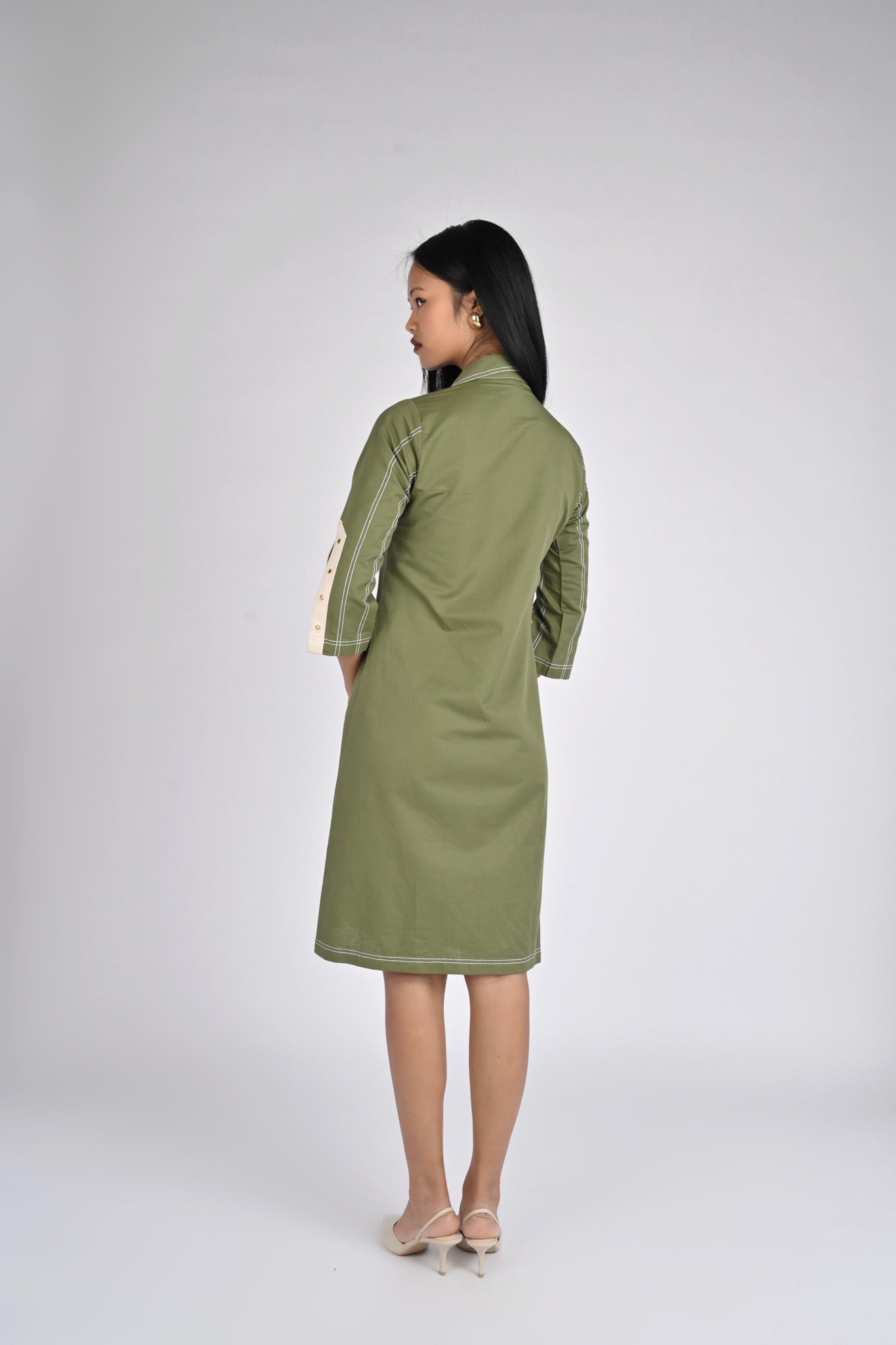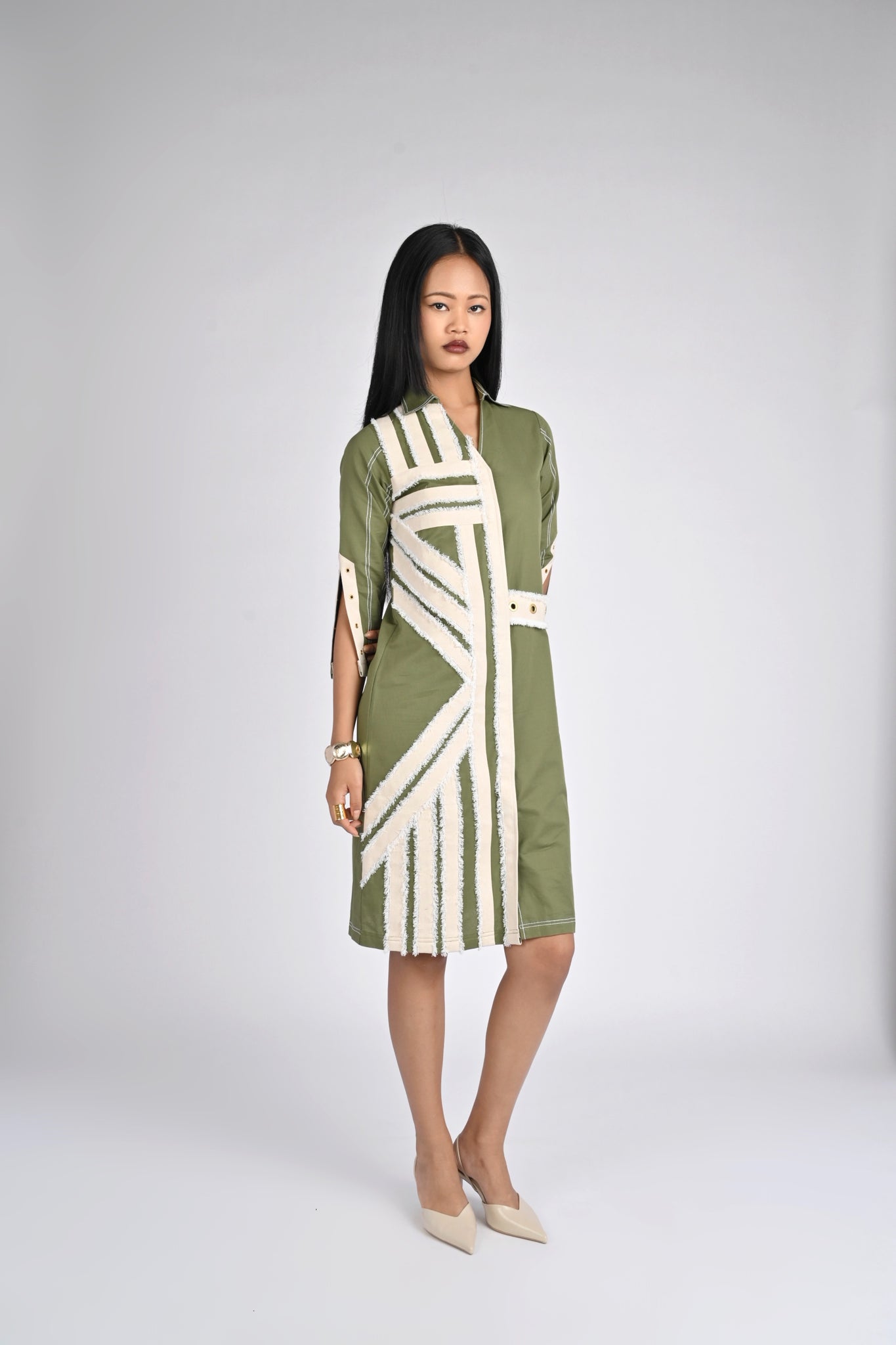 A striking piece that blends geometric precision with earthy charm, the Verdant Ascent Dress is crafted in a deep olive green and features bold paneling in cream with textured raw-edge accents. The angular pattern across the front brings movement and structure, while the asymmetric placket and grommet detailing at the sleeves and waist add a utilitarian edge. With a clean, tailored silhouette, this dress is a refined statement for the bold and design-forward woman.